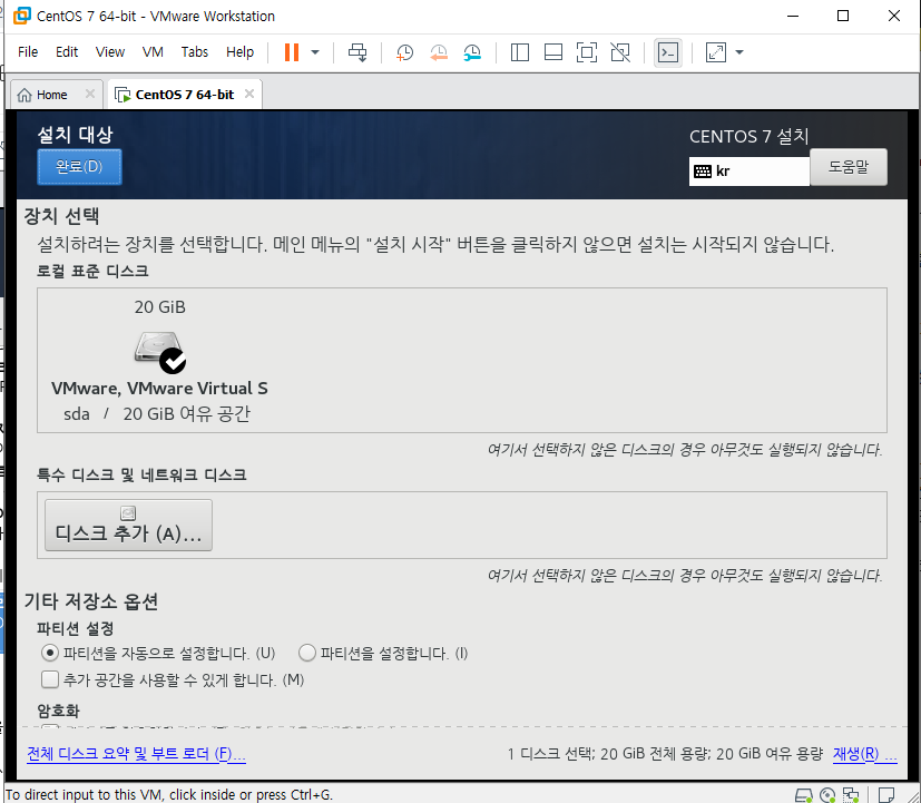 이전 화면에서 설치 대상 이라는 항목을 선택하면 다음과 같은 화면이 나타나게 된다. 디스크에 대한 설정이다. 파티션 분할, 설정, 디스크 추가 등을 선택할 수 있는 화면이다. 개인의 취향에 따라 선택하면 된다.