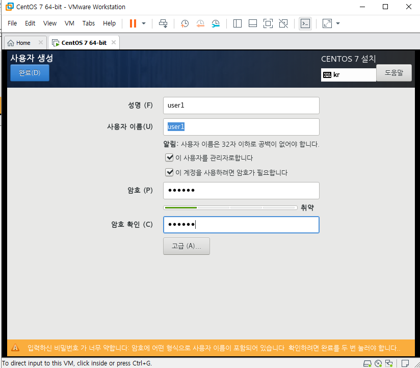 root는 이 후 CLI작업을 할때 권한을 위임받거나 하는 등의 복잡한(?) 환경을 사용할때 필요하다. 암호를 반드시 기억해 두자. 사용자 계정의 경우 일반적으로 컴퓨터를 부팅하고 접근하기 위한 계정이다. 관리자 설정 유무, 이름, 암호 등을 설정할 수 있다.