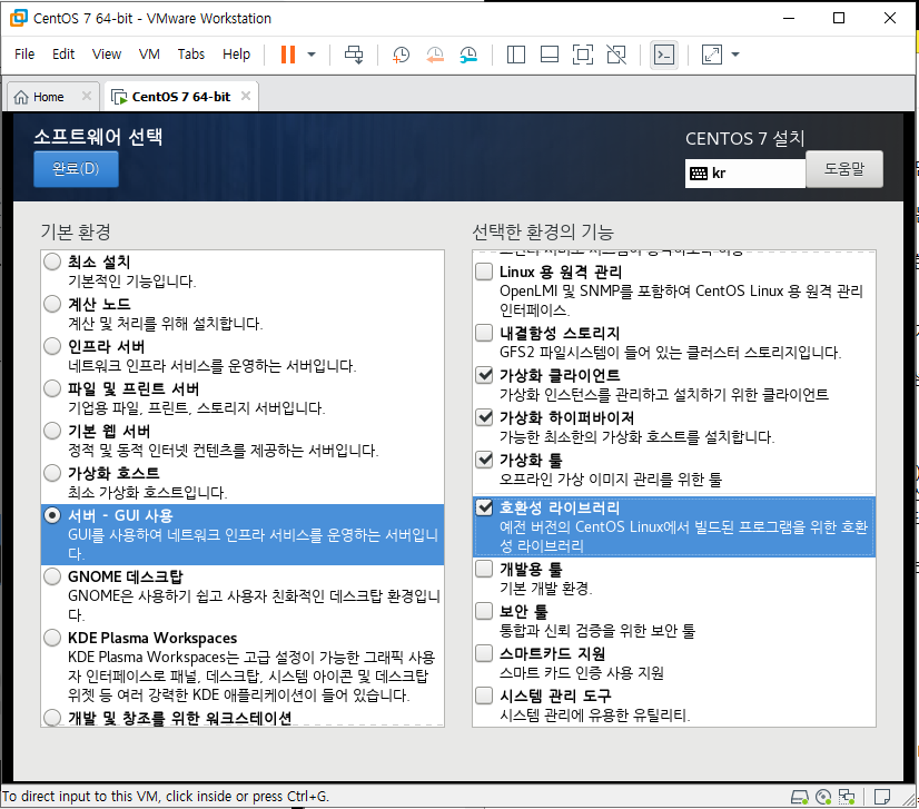 뭐가 이것저것 많다. 우리는 기본적으로 CLI를 활용하는것 보다 GUI를 활용하는것이 더 익숙하기 때문에 GUI를 선택하도록하자. 그 외로 선택하고 싶은 것들이 있다면 선택하면된다. 이후 완료를 클릭하면 이전 화면으로 돌아가게 된다.