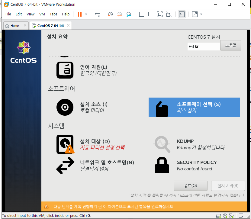 모든 설정이 완료되어 설치가 가능하다. 설치 시작을 선택하면 설치가 안된다