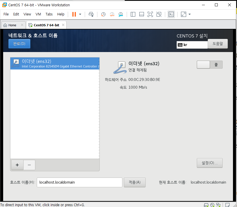 네트워크 및 호스트명 을 클릭하면 다음과 같은 화면이 나타난다. ens32 or ens33이라고 나타난다. 이더넷이 뭐에요? 라는 질문은 다른 포스팅을 통해 알려주겠다. 오른쪽 상단의 끔 이라는 항목을 클릭해 이더넷을 켜 주자.