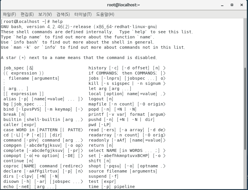지금까지 나온 명령어를 잘 모르겠다면 'help 잘 모르겠는 명령어' 라고 입력하면 영어로 친절히 알려주는 리눅스를 볼 수 있을 것 이다.