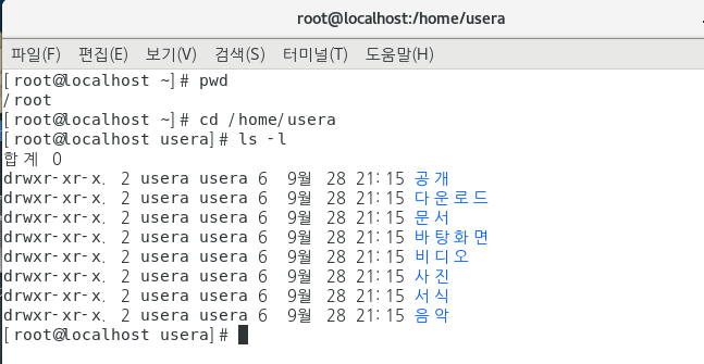 /root 즉 최상단에 위치하고 있다는 의미이다. 이제 우리는 'usera'로 찾아가는 시간을 가져보자. ' cd(움직여라) (띄워쓰기 필수)/home(root 단-지금 있는 위치-에 있는 home이라는 파일)/usera(home안에 있는 usera라는 파일) ' 라고 입력해 보자. 이 후 'ls -l(지금 위치에 있는 모든 폴더를 보여줘)'이라는 명령어를 이어서 입력하자.
