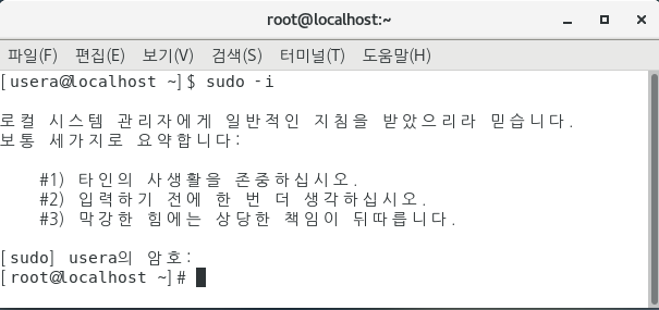 라는 명령어를 입력 해 보자. 무시무시한 안내문이 나타나고 usera의 암호문을 입력하라는 명령어가 나타난다. 설정한 암호를 입력하게 되면 $가 #으로 바뀐것을 확인할 수 있다. sudo 라는것은 'superuser do'의 약자로서 슈퍼유저 즉 막강한 관리자 권한을 부여할 수 있는 명령어이다. ' sudo rm -rf / ' 라는 명령어가 있는데 혹시나 지금 리눅스가 굉장히 마음에 안들어서 폭파 시키고싶다. 라는 마음을 먹게될때 사용하면된다. 하나도 남김없이 싹 다 지워지게된다. 정말 모든것이 사라지게된다.