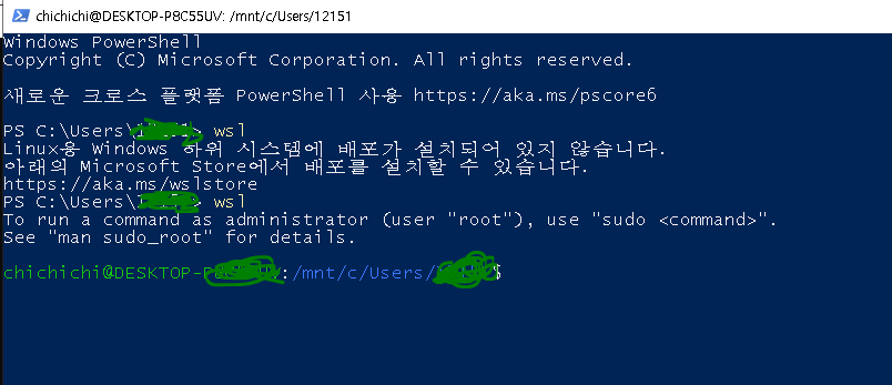 두 명령어가 완료된 이 후 재부팅을 해 두도록하자. 이제부터는 WSL명령어가 실행된다!! 재부팅을 완료한 후 다시 powershell을 켜주자. 그 이후 wsl이라고 입력하면 다음과 같은 화면이 나타난다. 이 얼마나 친절한가. 사랑해요 MS(취업 좀 시켜주세요 굽신굽신)