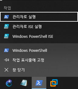 실행을 하게되면 뭔가 멋진 화면이 나타난다. 이제 이 powershell에 관리자 권한을 부여하자. 왼쪽 클릭 후 '관리자로 실행'을 클릭해 준다.