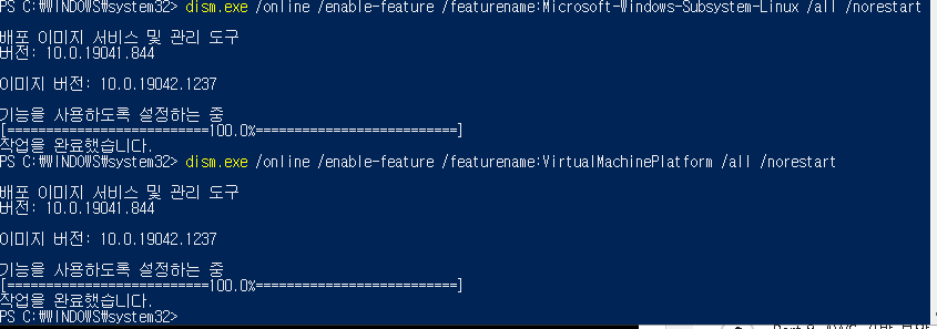 가상머신 플렛폼 기능 활성화 : dism.exe /online /enable-feature /featurename:VirtualMachinePlatform /all /norestart