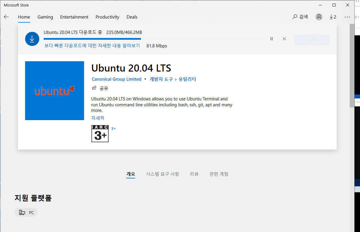 이 링크를 실행하게 되면 다음과 같은 화면이 나타난다. 여기서 우분투를 검색하도록 하자. 우리는 20.04LTS를 설치할 예정이니 이것을 다운받도록 하자. 심지어 무료다!