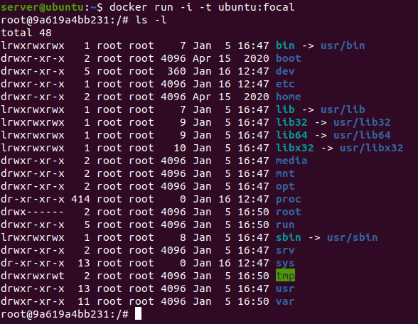 자 이제 우분투를 실행해 보도록 하자. docker run -i -t ubuntu:focal 명령어를 사용해 실행하도록 하자. 잘 되는것을 확인할 수 있다.