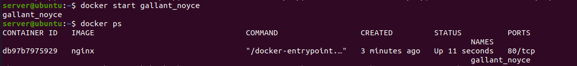 docker start [container] : 생성한 컨테이너를 시작한다.