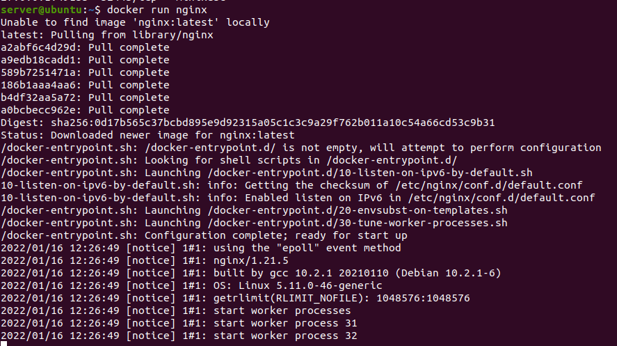 docker run nginx 명령어를 사용하면 아래와 같이 실행된다.
