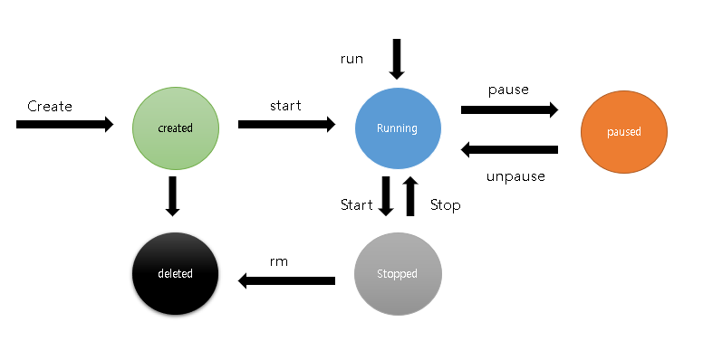 실행중인 컨테이너는 일시 중지(pause)로 갔다가 다시 실행되거나, 멈춘(stopped) 후 rm명령어를 통해 deleted를 하거나 start를 통해 다시 실행할 수 있다.