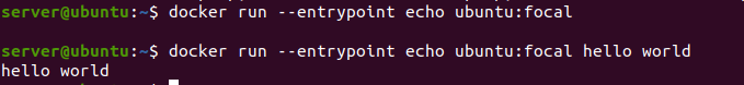 도커 명령어에서도 전달할 수 있는데 이미지에 지정된 엔트리포인트와 커멘드를 오버라이드 할 수 있다. 기본적으로 우분투 이미지를 실행할 때는 bash, sh, echo 명령어 등으로 실행할 수 있다.