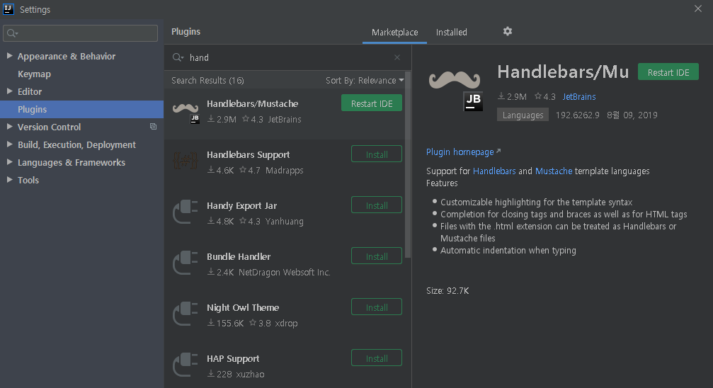 설치하는 방법도 간단하다. setting에 들어간 후 mustache를 검색 후 다운로드 받으면 된다.
