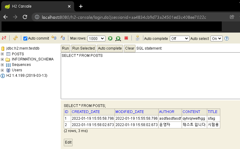 글이 등록되었다는 알람이 나타났다! 이제 이 알람이 실제로 적용되고 있는지 h2콘솔을 통해서 확인해 보도록하자. select*from posts를 실행해 보니 잘 저장된 것을 확인할 수 있다.