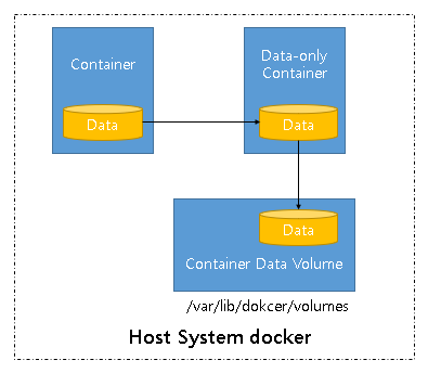 volume container를 통해서도 마운트를 공유할 수 있는데 아래의 그림을 보도록 하자. data-only container가 볼륨 컨테이너라고 생각하면 편하다. 볼륨을 특정 어플리케이션에서 마운트 시키는것이 아닌, 볼륨컨테이너에서 볼륨 마운트만 진행하는 컨테이너를 만들어 두는것이다. 이 상태에서 컨테이너는 데이터 컨테이너를 참조해서 해당 컨테이너를 볼륨 컨테이너처럼 사용할 수 있으며, 마운트목록을 공유할 수 있다는 의미이다.