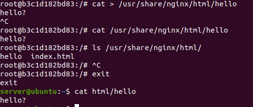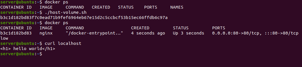 화면에 보듯 포트가 잘 바인드되었으며 curl을 실행했을때 아까 저장한 hello world를 잘 확인할 수 있다. 또한 exec 명령어를 사용했을때도 마찬가지로 잘 되는것을 확인할 수 있다. 디렉토리로 마운트를 했기 때문에 host에서도 확인할 수 있다.