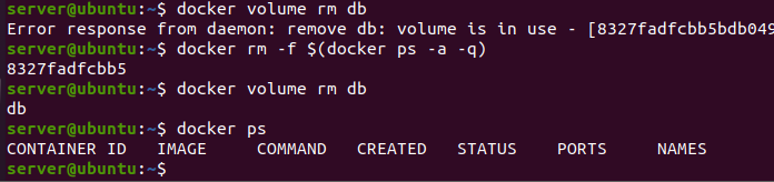 또한 volume 명령을 통해서 db를 삭제하고자 할 때는 반드시 컨테이너를 지우고 나서 db를 삭제해야지 된다.(아래 그림 참조)