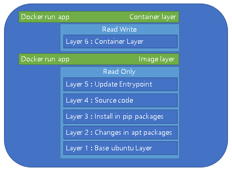 위 표는 ubuntu를베이스로 사용한다고 가정했을때의 layer architecture이다. 먼저 ubuntu layer가 쌓이고 그 다음으로는 필요로 하는 페키지를 설치하게 된다. 파이선과 관련된 pip 페키지가 그 다음으로 설치되며 소스코드를 복사한 다음으로는 엔트리포인트의 명령어를 변경하는것으로 image layer가 완성된다. 추후에 이미지를 변경하기에 정말 간편한데 pip(3번)를 바꾸고 싶으면 1,2의 레이어는 건들일 필요 없이 3번부터 새로운 레이어를 쌓아 올리면 되기 때문이다. 그렇기에 다양한 버전이 생기게 되더라도 저장공간이 별로 차지하지 않는 이미지이다.