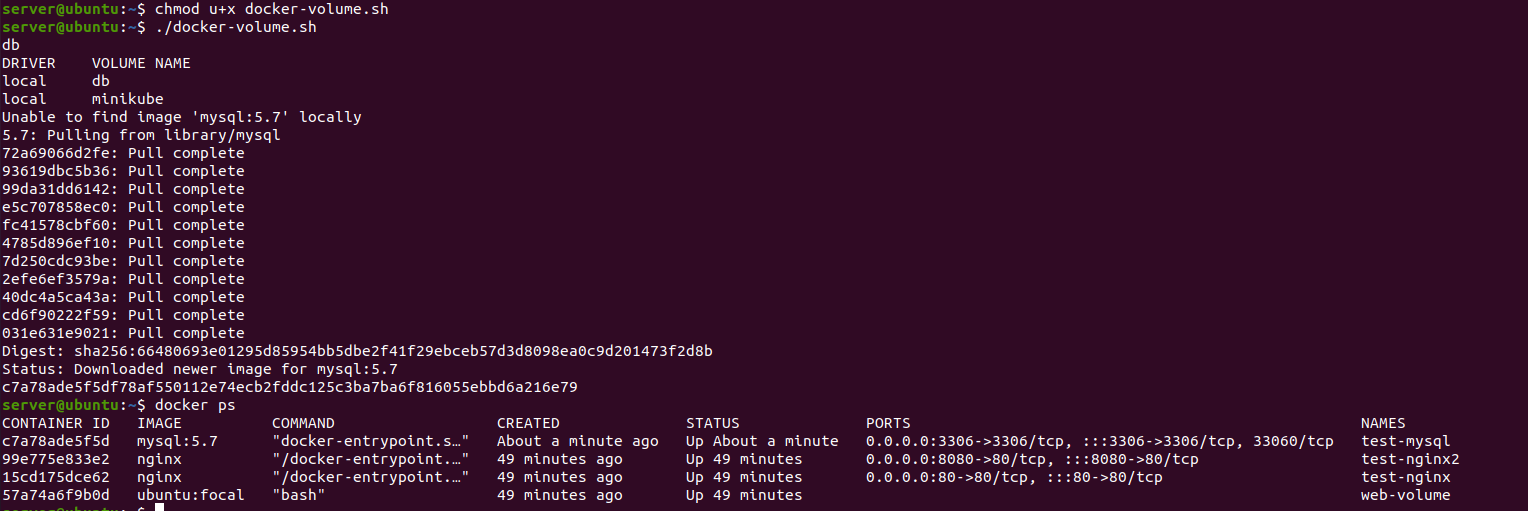 docker-volume.sh 을 만들도록 하자. 내용은 아래와 같다. db라는 이름의 볼륨을 만들것이며 볼륨목록을 확인한 후 mysql 컨테이너를 실행하는 절차이다. 이름은 test이다.