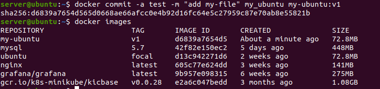 docker commit -a test -m "First Commit" ubuntu my_ubuntu:v1
