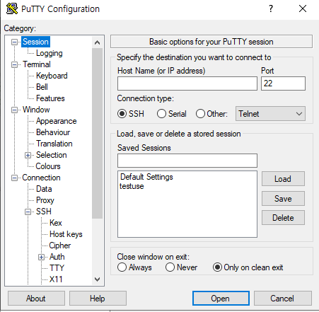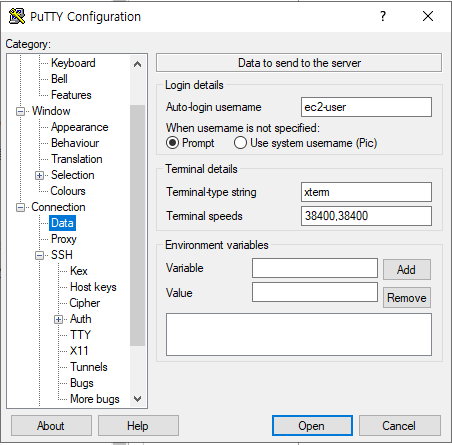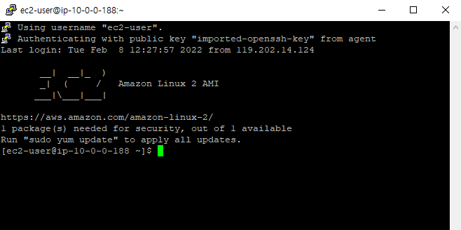 이제 putty를 실행하도록 하자. 조금 많이 복잡해 보이지만 괜찮다. 우리가 설정할 것은 host ip, connection의 data, ssh 의 auth 이것뿐이다. 가장 먼저 보이는 화면에서는 퍼블릭 서브넷의 ip를 입력하도록 하자. 다음으로 data에서는 username을 설정해 주도록 하자. 마지막으로 auth에서는 allow agent forwarding을 체크하도록하자. 이 후 open버튼을 클릭하면 잘 실행 되는것을 확인할 수 있다.