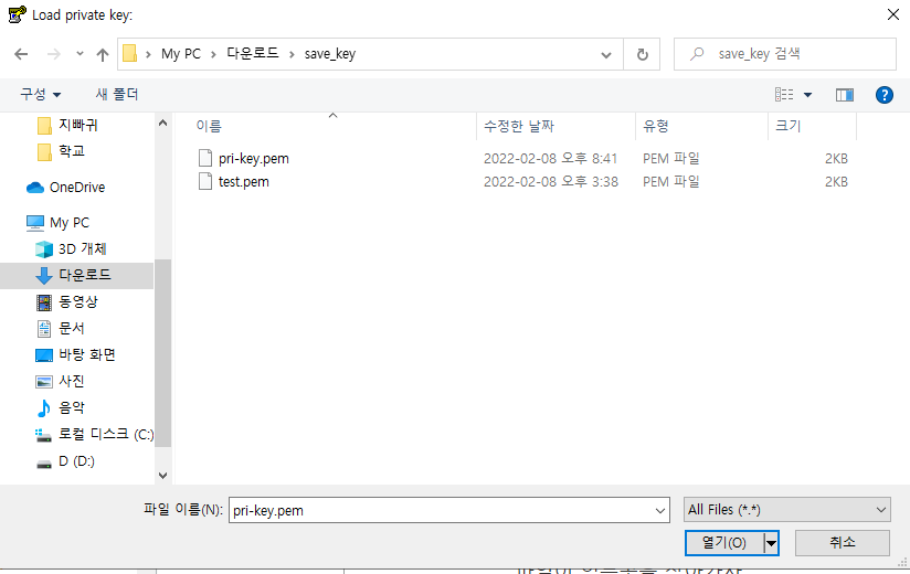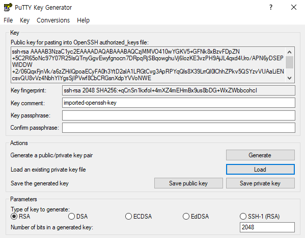 먼저 puttygen을 실행해 보도록 하자. 키페어를 putty에서 사용할 수 있도록 키 페어를 변환해 주는 프로그렘이다. 아무런 내용이 없는 아래와 같은 공백의 화면일 것이다. load를 클릭한 후 키페어 파일이 있는곳을 찾아가자. 이 후 반드시 오른쪽 하단의 세팅을 all file로 바꾼 후 키페어를 변환하도록 하자.