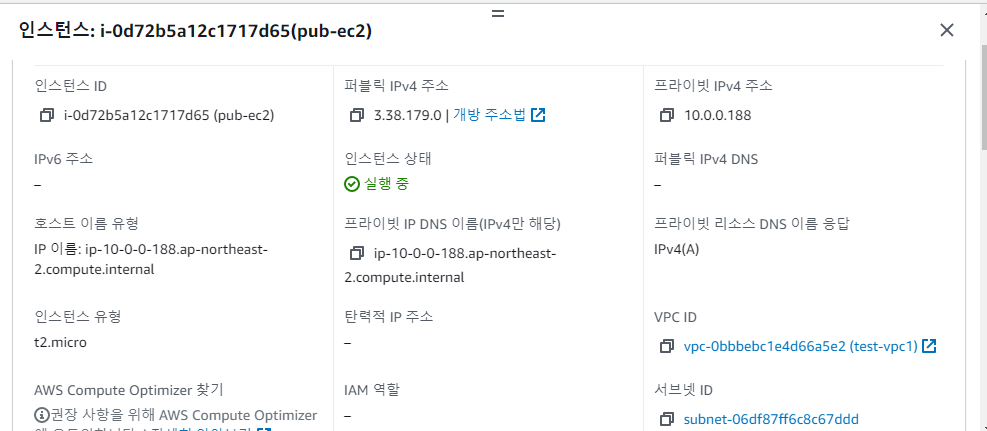 성공적으로 퍼블릭 ec2에 접속한 것을 확인할 수 있다. 그런데 무엇인가 조금 이상하지 않은가? 분명 처음에 입력한 pub-ip는 3. 으로 시작하지 않았나..? 10.0.0.188..? 이게 내..아이피? 라고 조금 당황할 수 가 있다. 하지만 너무 걱정안해도 된다. 퍼블릭한 ip라고 하더라도 AWS 안에는 프라이빗한 ip가 있다.