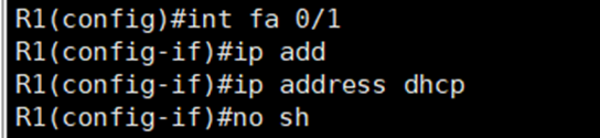 4. router1을 클릭 후 녹색 시작 버튼을 클릭 후 >_ 버튼을 클릭한다. 그럼 interface화면이 나타나는데 fa0/1에 dhcp를 연결하기 위한 명령어를 사용하도록 하자.