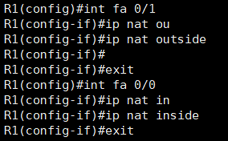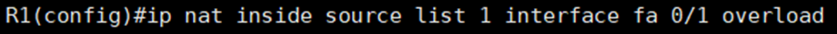 7. 이제 fa0/1을 overload해 준 후 nat inside, outside를 각각 설정해 주도록 하자.