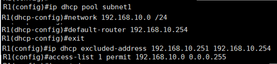 6. dhcp에 pool name(이름, subnet1), network(range), default-router(gateway값), exclude(사용하지 않을 ip값), ACL정책을 지정해 준다.