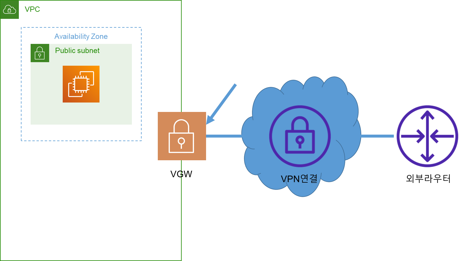 VPC와 다른 네트워크 사이에서 프라이빗 연결(VPC)를 연결하고 설정할 수 있다. 보통 라우터 장비만 가지고도 VPN환경이나 VPN장비를 통해서 만들 수 있다. 하지만 AWS에서는 VPN장비가 지원되지 않으며, 이때 가상 프라이빗 게이트웨이(VGW)를 사용해야한다. 아래의 그림과 같이 외부에서 접근할때 VGW를 통해서 접근할 수 있다. 이런 VGW는 여러개가 아닌 1개만 설치해도 여러대의 라우터와 연결이 가능하다.