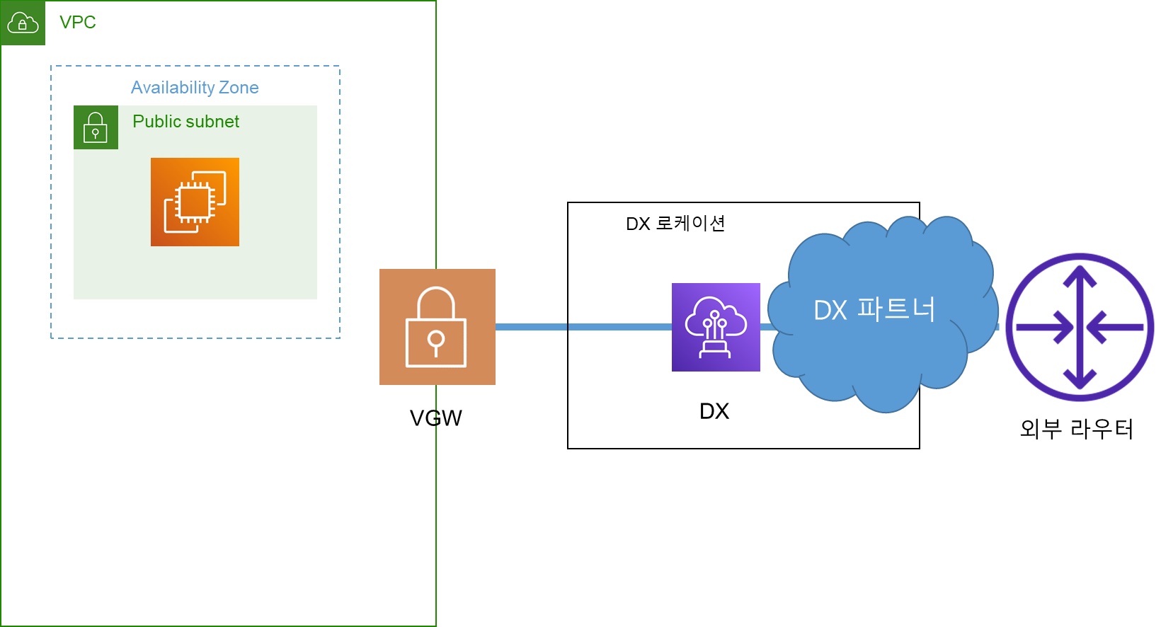 AWS DX(Direct Connect)는 전용 프라이빗 네트워크가 연결된다. 외부에서 광케이블을 가져와서 장비와 직접적으로 연결 즉 실제 물리적인 사설망이 구축이 된다. VPN보다 데이터 전송비용이 적게 들고, VPN보다 더 높은 성능과 안정성을 제공해준다. 하지만, 계약기간 등의 현실세계의 이슈가 있다는 단점이 있다.