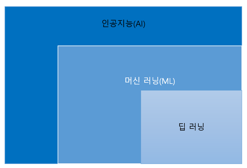 체스를 예로들어서 가정해 보자면, 단순히 체스룰을 코딩화하여 체스를 둘 수 있도록 만든 앱은 인공지능이 될 수 있다. 여기에서 조금 더 성장하여, 과거의 기보(대국이 흐른 과정)을 바탕으로 체스를 두는법을 스스로 학습한다면 ML이 될 수 있다. 딥러닝의 경우 대국을 할 동일 기기 2개와 서로를 상대하며 체스 두는법을 스스로 학습할 수 있는 시스템을 의미한다. 가장 유명한 것은 알파고 를 예시로 둘 수 있다.