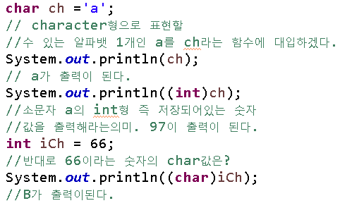 이런 문자를 변수에 저장하게 된다면 문자에 해당되는 코드의 값이 저장이 된다.