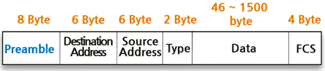 FCS부터 Destination Address까지가 프레임의 헤더의 범위이며 Preamble이 예비신호를 보내는 동기신호이다.