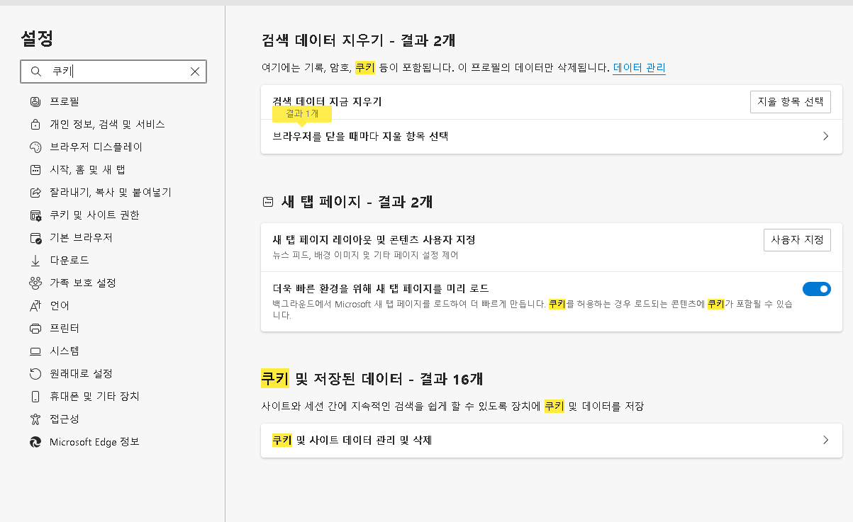 인터넷에도 쿠키라는게 존재한다. 다음의 화면은 '마이크로소프트 엣지'라는 브라우저의 설정창에서 쿠키를 검색했을때 나타나는 화면이다. 주로 기록, 암호, 쿠키, 데이터 등이 연관이 되어있음을 알 수 있다.