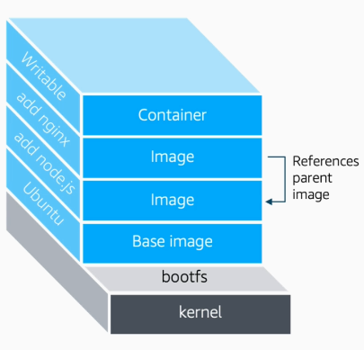 하단 LV는 시스템 커널이며 커널 위에는 기본 이미지인 bootfs, 컨테이너를 빌드하기 위한 시작점인 컨테이너 이미지이다. 기본 이미지는 우분투 등과 같은 범용(혹은 컨테이너 최적화)이미지를 기반으로 설정할 수 있다. 기본 이미지에는 공통적인 종속성이나 보안 강화 등의 설정이 있다. 이 위에 레이어를 추가하며 이를 통해 기타 항목을 추가할 수 있다. 컨테이너 이미지는 기본 이미지와 여기에 추가한 모든 레이어의 합이 될 수 있다. 컨테이너 이미지는 도커 파일 안의 모든 명령어로 구성되어 있기 때문에 재현가능한 빌드를 쉽게 설정할 수 있다. 도커 명령을 다시 실행할 때마다 모든 레이어가 컨테이너 이미지를 만든다. 이런 컨테이너 이미지는 생성된 후에는 변경할 수 없다. 그렇기에 문제가 발생했을 경우 도커를 변경해 새로운 컨테이너 이미지를 만들어야 한다. 이 후 컨테이너 이미지를 통해 하나의 템플릿의 역할로 시작하게된다. 컨테이너를 시작하게 되면 쓰기가능한 임시레이어가 모든 레이어 위에 추가가 되며 작업을 종료하게 되면 이 레이어는 모두다 삭제가 된다. 마치 RAM과 같은 역할이다.