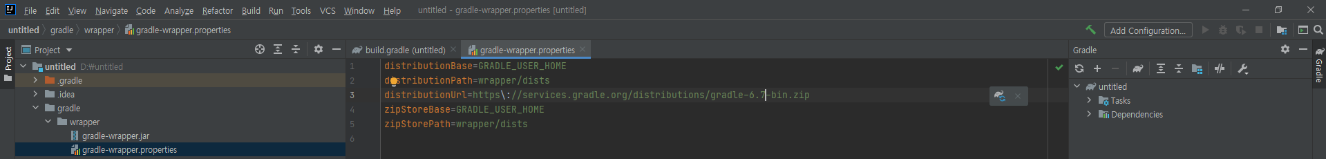 먼저 gradle 을 클릭하자. 여기서 주의할점은 .gradle이 아니라 그냥 gradle이다.(주황색이 아니다! 주황색이!) wrapper을 클릭하면 gradle-wrapper.properties가 나올건데 이놈을 클릭해 보자. 에러메세지에서 보던놈이랑 뭔가 비슷한 놈이 보인다. 어쩌고 저쩌고 그리들 6.7-bin.zip을 원하는 버전으로 바꿔주자. 필자는 6.9 버전으로 업데이트를 했다.