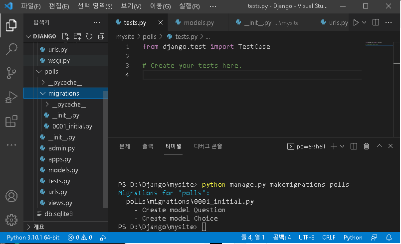 뭔가 쭉쭉 지나가며 OK가 계속 나타날것이다. 길어봤자 5초안에 다 해결되니 그 다음은 모델을 형성하자. polls안의 mobels.py(클레스를 정한 후 CRUD(생성,읽기,수정 혹은 갱신,삭제,를 할 수 있는 공간)에 다음과 같은 코드를 작성하자.