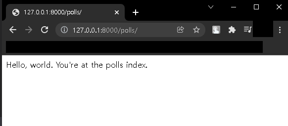 3. 명령어 path('polls/', include('polls.urls')), 를 봤을때 polls/라는 형식을 가진 리퀘스트의 경우 polls.url로 보내버려라. 라는 것을 확인할 수 있다.