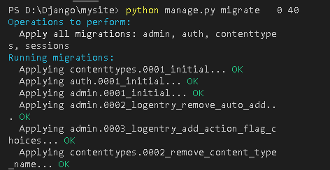 migrations라는 폴더와 0001_initial.py라는 폴더가 생긴것을 확인할 수 있다. 이 후 다시 아래의 명령어를 실행하도록 하자. db.sqlite3 의 데이터로 스키마를 만들어 달라는 명령어 이다.