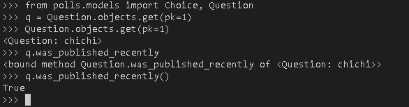 가운데 q.was_published_recently 만 입력하니 오류가 나타났다..()는 필수다.