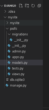 그럼 다음과 같이 polls라는 폴더와 각종 py파일이 설치된 것을 확인할 수 있을 것이며 주요 py는 다음과 같다.