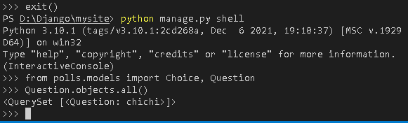 그런데 Question object (1) 이라고만 되어있으면 우리가 넣은 object의 값이 최초입력값인지 변경된 값인지 알 턱이 없다. 가시성을 확보하기 위해 그렇기에 polls의 models.py에 하나의 함수를 추가해 보도록 하자. Question 함수에는 question을, Choice함수에는 choice를 추가하자. __str__ 이라는 함수를 추가하는것이다.